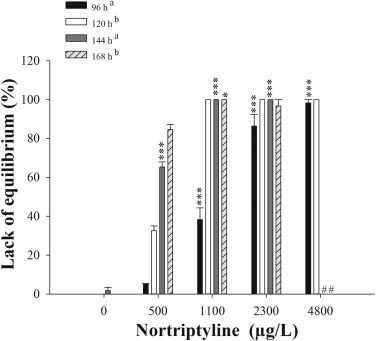图3、去甲替林(NTP)对斑马鱼幼虫在96~168小时暴露期间缺乏平衡的影响。