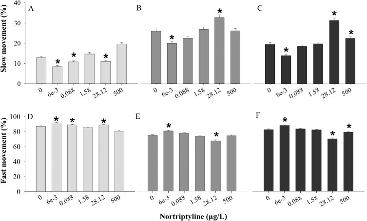 在NTP暴露后,幼虫的行为,就缓慢和快速移动而言也发生了变化。我们观察到,与对照组相比,暴露于最低NTP浓度(0.006µg/L)的幼虫在120、144和168小时后SM减少,FM增加。与对照相比,但仅在暴露120 h后,在0.088μg/ L时也检测到SM显着降低和FM升高。与对照相比,在168µh暴露后,仅以500µg / L NTP观察到SM的增加和FM的减少。