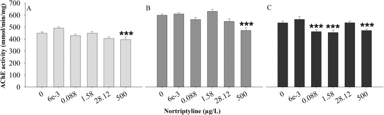 图6、去甲替林(NTP)对斑马鱼幼虫乙酰胆碱酯酶(AChE)活性的影响。