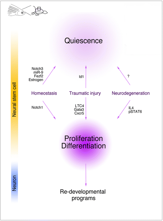 摘要:这项研究的目的是审查在斑马鱼脑再生能力基础上的损伤诱导分子程序的知识。最新发现:神经干细胞是脊椎动物大脑发育和再生过程中新神经元的储存库。病理状态如神经变性疾病阻碍了人类神经干细胞可塑性和神经源性结果,而成年斑马鱼大脑尽管有早期病理学,但仍能增强神经干细胞的增殖和神经原性。有证据表明斑马鱼利用损伤诱导的分子程序使神经干细胞有效地启动再生。由于这种能力可能被用于人类大脑的再生治疗,了解调控斑马鱼的神经干细胞的增殖和静止的分子程序对临床工作而言是最重要的。结果: 与稳态条件不同的特异性分子程序调节成年斑马鱼神经干细胞可塑性和损伤后再生能力和神经退行性变。这些程序可以作为人类干细胞再生疗法的候选方法。关键词:再生 退行性疾病 神经 成年斑马鱼大脑 神经干细胞 诱导可塑性神经干细胞是脊椎动物发育和再生过程中新生神经元的主要来源,它们在再生医学中的应用是设计新治疗方法的动力。因此,了解疾病状态下神经干细胞可塑性和神经原性能力的分子基础对于生成利用这种机制在人脑中有效再生的机制是很重要的。在神经系统发育过程中,放射状胶质细胞能产生所有的神经元亚型,并伴随着新生神经元的成熟、模式化和突触整合,建立了神经系统的最初框架。在哺乳动物中,在出生后的发育过程中,大多数的放射状胶质细胞转化为星形胶质细胞,另一种胶质细胞在体内的神经原性可能潜力大大减少。至少在两个专门的干细胞区中有一部分星形胶质细胞被排除在外,即侧脑室的脑室下区(SVZ)和海马齿状回(DG),构成神经持续发生。在其他脊椎动物中如硬骨鱼和一些两栖动物神经干细胞在整个脑组织中的分布仍然不受限制,神经干细胞仍保留其放射状胶质细胞特征。因此,对于解决与衰老和病理有关的神经干细胞可塑性和神经原性能力的问题,成年斑马鱼脑是一个优秀的脊椎动物实验系统。哺乳动物和斑马鱼神经干细胞对损伤和疾病的反应不同。在哺乳动物的大脑外伤或中风后,尽管神经干细胞增殖的增加,最终是低效的神经和形成胶质瘢痕,这是星形胶质细胞聚集病变部位周围的一个永久性的结构,使组织修复不可行。相反,成年斑马鱼大脑中的创伤导致神经干细胞增殖增加,不会引起胶质瘢痕,因此可以产生新的神经元,从而整合到其他系统中。斑马鱼与哺乳动物大脑的再生能力在神经变性后也能得到类似的对比。在哺乳动物中几乎所有的神经变性疾病中,神经干细胞的增殖都是逐渐减少的,当神经元死亡水平升高时,大脑质量就会大量减少。例如,一些脑淀粉样变性模型小鼠阿尔茨海默症,神经干细胞增殖,严重降低部分原因是淀粉样蛋白β-42升高,从淀粉样前体蛋白中提取的一种不溶性小肽,聚集成有毒的β-片结构,构成阿尔茨海默病病理学的主要特征之一。然而,在斑马鱼中,虽然淀粉样蛋白的毒性导致阿尔茨海默氏症的人的大脑相似的症状(例如,淀粉样蛋白-β-42聚集、细胞死亡、炎症、突触变性和认知能力下降)。成年斑马鱼大脑中的神经干细胞能增加它们的增殖能力,形成新的神经元,在毒性作用下存活,并整合到系统中。这些研究结果表明,成年斑马鱼大脑的再生能力是神经元损伤后神经干细胞可塑性诱导的结果,了解斑马鱼如何能有效地再生,可能有助于我们利用这种“自然”知识,在人脑中启动类似的神经再生反应。斑马鱼利用损伤诱导的分子程序激活神经干细胞:再生能力似乎依赖于大脑中的病理环境和神经干细胞的神经元丢失类型的独特解释。这一假说支持不同的损伤或疾病模型激活不同的分子程序和神经干细胞和包括小胶质细胞和神经元在内的各种细胞类型之间的串扰机制。成年斑马鱼脑内的创伤导致急性炎症反应,其中包括促炎性细胞因子和趋化因子,这通常损害哺乳动物的神经干细胞可塑性和再生能力。通过增加成年斑马鱼大脑的LTC4, 积极调控神经干细胞的增殖。通过诱导GATA3(创伤后神经干细胞诱导增殖的转录因子)的表达,LTC4足以激活损伤依赖再生程序。CXCR5,趋化因子受体,还增加损伤后的表达,对增殖神经干细胞向神经元分化是必需的。另一项研究发现,在成年斑马鱼脑外伤性损伤后5天,Notch信号调节碱性螺旋-环-螺旋蛋白ID1诱导其最大的表达水平。质粒过表达降低神经干细胞增殖。急性炎症反应的协同效应,GATA3,ID1对诱导成年斑马鱼脑损伤后神经干细胞增殖的启动与平衡独立于神经干细胞的稳态调节。Notch信号是一种干细胞休眠的主要决定因素,大脑皮层的梯度是由转录因子Fezf2调节,微RNA miR-9是成年鱼脑发育和稳态过程中Notch信号通路的下游感受器。虽然Notch信号的部件或miR-9在增殖和静止中表达平衡,这些影响不受GATA3的表达影响。这些发现表明成年斑马鱼大脑似乎进化出了复杂的损伤诱导分子程序取代神经干细胞可塑性的发育程序后根据病理神经发生的高需求时间调整增殖静止平衡。创伤后神经干细胞再生神经反应的分子基础也不同于增强的神经发生,而依赖于一组复杂的细胞串扰,为新神经元的重新开发奠定了基础。在稳态和再生过程中,对神经干细胞可塑性的不同调控机制的支持是通过雌激素作用,只有在健康的大脑中才能减少心室祖细胞的增殖,而雌激素治疗不会影响成年斑马鱼脑外伤后神经干细胞的增殖。神经退行性疾病引起