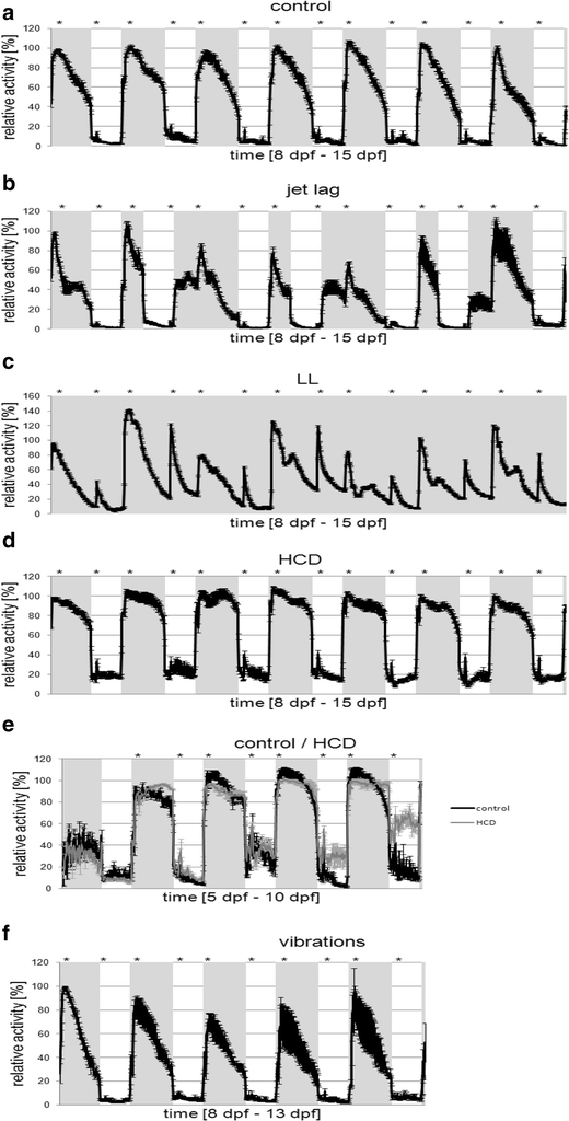 摘要:行为学是理解神经系统疾病发展和病理的重要工具。斑马鱼是一种新兴的行为和神经研究模型因为斑马鱼的行为能力类似于人类,其神经系统结构和功能是高度保守的。通过光/暗周期的节奏或食物的卡路里含量的变化。研究野生型斑马鱼自由泳白天/夜间自发活动的改变。应用交替小振动,将斑马鱼幼虫暴露于持续的压力下。在光周期变化规律下,斑马鱼幼虫仍表现出明显的光/暗活动模式,但总活性较对照组减少。幼虫暴露在连续光照下,协调休息周期后,但最大活性和激发率均升高,表明食物成为新的授时因子。喂食高热量食物会在光周期中呈现持续高活性水平,并在黑暗中显著提高活动水平。暴露于连续的振动降低了总的活动水平。环境因素的变化如光/暗周期或食物热量含量的变化可以影响脂肪细胞,脂质成分和自由泳的昼夜节律,但这是第一次展示这些因素改变行为。关键词:斑马鱼 自发活动 光 声音/振动 刺激 饮食环境 简介:斑马鱼是发育生物学中公认的模型物种,是行为学和神经学研究中新出现的替代模型。它们的行为方式与啮齿类动物和人类相似,神经系统结构和功能高度保守。斑马鱼在胚胎发育的120小时内,发育成一个复杂的神经系统。经过1周的发育,斑马鱼幼虫已经表现出与成年人一样复杂的行为模式。斑马鱼幼虫在游、转和捕捉祈祷时显示出明确的运动指令。斑马鱼的行为很容易被自动化的视频跟踪系统监控,由于幼虫的体积小,这些实验可以在多孔板,培养皿,或小槽开展直至成年期。斑马鱼的行为测试越来越多地用于神经毒性研究以及研究诸如阿尔茨海默病或痴呆等神经系统疾病。斑马鱼的行为与人类相似,可以受到环境因素的影响,如光和温度变化以及外界刺激,如化学物质或声音/振动。活动和休息时间是由昼夜节律决定的。与人类一样,斑马鱼在黑暗期表现出昼夜活动模式和休息。受精后20小时左右,斑马鱼对光出现反应。受精后的第一天,对短暂的闪光他们的反应是重尾抽搐,,而受精后5天(DPF),出现一个明显的昼夜活动规律表达。斑马鱼对振动也高度敏感,并有强烈的逃避反应。振动检测,斑马鱼发展两机械感觉系统:内耳和侧线。从受精后5天开始,当耳石的钙化和鳔充气,斑马鱼幼虫对声信号反应惊人。振动可以被看作是最强的应激刺激之一,斑马鱼调节自适应应激反应的下丘脑-垂体-肾上腺皮质轴与人的方式类似。一般说来,斑马鱼对环境变化反应灵敏。已有许多研究调查环境因素对受精后幼虫直至6 DPF的行为影响。摄食和光/暗周期的变化也能改变游泳行为。斑马鱼幼虫在黑暗中表现出活动模式的改变,这种效应与昼夜节律基因的变化有关。另外,食物剥夺对活动模式的双相影响首先导致更高的活性,其次是活性降低。但目前还不清楚环境因素的变化,如热量食物含量,白天/黑夜周期的变化,以及持续的压力暴露,如振动刺激对幼虫正常基线行为的影响。在以前的研究中,我们已经可以证明改变的日/夜循环和食物含量明显影响脂肪细胞,脂质成分,和斑马鱼幼虫的昼夜节律,但我们没有调查行为活动的影响。为了更深入地了解环境因素对活动模式变化的影响,我们进行了以下研究。我们研究了TL野生型斑马鱼在光/暗周期或食物的卡路里含量的节奏变化。此外,我们还将斑马鱼幼虫暴露在持续7天的声音/振动中。通过比较不同环境因素下的总活性、昼/夜活动和兴奋率,我们能够清楚地表明,光/暗周期、食物和连续振动的暴露都会显著影响基线运动行为。材料和方法:实验设计:选用野生型IL斑马鱼,一孔约30个个体。在产卵后不久,将卵混合并转移到胚胎培养基中(5 mM NaCl,0.17 mM KCl、0.33 mM氯化钙和0.33mM硫酸镁),胚胎和幼虫在温度(26°C)和光(14/10光/暗)培养条件下孵化。从受精后第6天,添加婴儿辅食,一天两次。在胚胎培养基中加入煮沸的鸡卵黄代替一次喂养,喂食4毫升的悬浮液。幼虫在灯亮后1h和灯灭后2h被喂养。这两个时间点被选中,以确保可比较的饲养条件。监测通常在标准条件下(8 DPF)开始,以规范实验,检查幼虫在实验前的正常行为。在第9天,开始了不同的实验条件:时差、连续光(LL)和声音暴露。声音的振动实验,使用振动模块系统,将扬声器振动直接传递到多孔板。斑马鱼幼虫暴露在交替的声音/振动中。声音被选择以确保不规则的振动模式,只有轻微的振幅变化。因此,习惯的影响以及偶尔的过度可以最小化。对声音的强度进行了调整,避免视觉上的振动。行为分析:每一个透明的6孔板充满了胚胎培养基 和10条斑马鱼幼虫。选择样本大小以尽量减少动物数量,但仍能发现显著差异并保证动物福利(群体行为)。6孔培养板中加入一个温度控制的自动观测系统。适用于昼夜周期模拟的可控白光光源和具有高图像清晰度的红外高灵敏度相机,可用于监测7天内的自发活动。每天喂两次幼虫,并在喂食前一天刷新一次。为了避免介质交换干扰信号,这是在观测系统之外进行的。通过监测时间建立了每孔活动曲线,在一个孔内所有的幼虫在10分钟内活动(运动阈值7厘米/秒)。因此,每个实验组的数据由10个幼虫产生的6条活动曲线组成。对于每一个活动曲线,第九个观测日的最大活动值被设定为100%,排除个体变化。总活度是通过计算活度曲线以下的面积来确定的。在喂食和开灯之后,每次刺激事件都会读出刺激(以整个实验周期为基