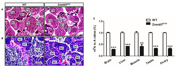 A. WT 和 Zmettl3m/ m 斑马鱼卵巢组织石蜡切片; B. WT 和 Zmettl3m/ m 斑马鱼精巢组织石蜡切片; C. WT 和 Zmettl3m/ m 斑马鱼各个组织中 m6A 的含量