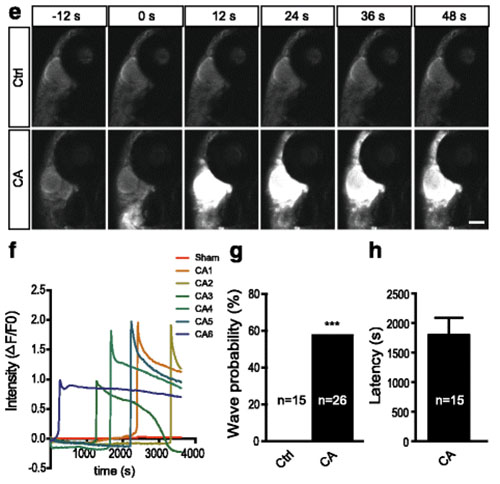 摘要:心脏骤停是全世界死亡和残疾的主要原因。虽然许多受害者初步复苏,他们经常遭受严重的脑损伤,甚至导致“持续性植物状态。因此,有必要探索心脏骤停后恢复和保护脑功能的治疗方法。在本研究中,我们利用斑马鱼斑马鱼为模型,利用活体时移共焦成像技术,发现斑马鱼脑在心搏停止后产生了一个爆发的钙波。Ca2+波首先在后脑发起然后依次传播到中脑和前脑,神经元在Ca2+波传播后出现钙超载。与此一致的是,我们的研究进一步证明心脏停跳斑马鱼神经细胞凋亡增加。全身麻醉剂如咪唑安定或氯胺酮预处理可防止心脏骤停引起的钙波传播。咪达唑仑或氯胺酮预处理能显著降低CA斑马鱼神经细胞凋亡率,提高存活率。总之,这些发现首次证明了全身麻醉药预处理能抑制钙波在斑马鱼体内的传播,从而防止心脏骤停引起的脑损伤。关键词; 全身麻醉药;钙波;心搏骤停;脑损伤;斑马鱼简介:心脏骤停(CA)仍然是全世界死亡和持续残疾的主要原因,尽管急救医疗和急诊人工心肺复苏(CPR)得到了巨大的改善。许多受害者初步复苏,但他们往往会受到广泛的后期钙的综合征,包括神经损害,心肌功能障碍,全身炎症反应。脑损伤占CA后残疾的最大比例。许多存活出院的CA患者经历持续性认知损害,严重影响他们的生活质量。迄今为止,还没有有效的药物来保护大脑免受缺血性损伤。虽然治疗性体温过低明显地改善了心室颤动引起的脑损伤,但这些患者的临床效果是相当轻微的,在大多数自发循环的患者中,有20%的患者受益于低温疗法。因此,有必要对脑损伤机制进行解读,并制定治疗方案,以提高CA.的生存和改善生活质量。CA后启动大脑中的复杂级联反应,包括ATP耗竭,活性氧的过度形成,蛋白酶的病理激活,细胞死亡信号,诱导炎症和谷氨酸兴奋性毒性。其中,一些机制在循环停止后数小时到数天执行。目前的研究多集中于促进自发性循环恢复后迟发性脑损伤的恢复。但在CA.早期,没有迅速的治疗干预来减轻脑损伤的程度。利用斑马鱼胚胎模型的脑和心脏的透明度,以及在体内操作的可用性。我们使用转基因TG(HUC:gcamp5)斑马鱼,胞内钙离子动态变化显示神经元活动,应用活体时移共焦成像观察ca在神经元活动中的动态变化。我们首先监测了斑马鱼脑在CA后产生的钙离子爆发波。Ca2+波首先发起在后脑然后依次传播从中脑前脑。神经元在钙离子扩散波后出现钙超载,表明钙离子传播波引起神经元死亡。全身麻醉药预处理可抑制钙诱导的钙离子波。总的来说,全麻药预处理能显著减少神经细胞死亡,提高CA斑马鱼的存活率和运动能力。总之,我们的研究揭示了CA脑损伤后爆发的钙离子波的传播。全身麻醉药预处理可抑制钙诱导的钙离子通道,改善CA.神经系统的预后。方法:斑马鱼心脏停搏模式: 在受精后7天(DPF),在侧卧位无麻醉TG(HUC:gcamp5)转基因斑马鱼被嵌入在1%低熔点琼脂糖。一个玻璃管固定到微操作机器人被用于慢慢按下斑马鱼心脏直到心脏停止跳动。监测躯干和脑血管血流量,评价心跳骤停。光镜下躯干和脑血管血流停止,认为心脏停搏模型成功。心脏停搏时间维持在1小时左右。评估活动或生存率后,钙,玻璃微针去除让心跳恢复。只有成功的心脏跳动的幼虫被用于随后的实验。在对照斑马鱼,只有心包,而不是心脏,被按下。体内钙成像缩时摄影:时间分辨率为800×800像素的图像在1 - 2赫兹获得。对非麻醉的幼虫进行影像。在建立心搏停止之前,将幼虫成像20分钟作为对照,然后在CA.之后每条鱼进行1小时的成像。对斑马鱼幼虫在室温(26~28℃)进行成像。神经元钙离子活性分析:对时间推移图像进行处理,检测并分析钙波。在第一帧中,在上升阶段波的峰值振幅为5%。根据目视检查确定各波的时间和阈值,以便更好地检测波的边界。药物处理:在建立CA模型之前,斑马鱼用咪达唑仑(0.1 - 0.5mM)或氯胺酮(1 - 2.5 mM)进行5分钟的预处理。为了保持药物的有效浓度,胚胎介质在体内延时成像时涉及到相应的药物。为了评估运动功能或存活率,在体内延时成像后,用无药物胚胎介质代替含有药物的胚胎培养基。TUNEL染色:在7 DPF时对幼虫脑冠状进行100μm切片,并进行TUNEL染色。行为测试:所有的行为试验都是在室温(28°C)的一个区域进行的。行为测试包括记录24孔板中的幼虫。先前描述并实现了斑马鱼行为测试的视频采集系统。视频采集系统的参数设置为:检测阈值:20,小/大运动阈值:2,小运动阈值:0.2。在1 DPF CA后评价了斑马鱼幼虫的自发的游泳行为,.每孔24孔板充满了1毫升的水和每孔放入一个胚胎幼虫。经过30分钟的驯化,记录一小时的运动性能和测量总距离。结果:心脏骤停导致斑马鱼脑内钙离子爆发:CA后体内神经元活性变化的研究,我们使用TG(HUC:gcamp5)转基因斑马鱼,其中细胞内Ca2+动态变化表明神经元的活动,记录神经元活动的实时变化。用机械加压心脏建立斑马鱼CA模型,用微电极泵直至停止。用活体时移聚焦成像研究CA时神经元活动。几乎所有的斑马鱼在按压后1分钟内停止心脏泵血。我们发现斑马鱼的大脑在CA.之后出现了一个钙离子爆发波。Ca2+波在后脑首先发起,然后依次传递到中脑和前脑。与对照组相比,57.7%(15/26)CA斑马鱼脑显示钙离子波,钙钙生成的潜伏期约为1801±291.2 s。神经元在钙离子波的传播过程中显示钙超载。总之,这些结果表明钙离子在ca后的增殖可导致神经元死亡。咪达唑