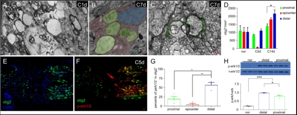 视神经损伤后远端少突胶质细胞存活并增殖:为了研究视神经压伤后少突胶质细胞的命运,我们在受伤后第一天观察到远端残端的髓鞘塌陷,发现髓鞘碎片在 7 dpi 被侵入的小胶质细胞/巨噬细胞吞噬。在 7 dpi 也观察到髓鞘再生的开始,这表明远端节段的少突胶质细胞会在视神经损伤后存活。 接下来,我们计算视神经中olig2+细胞的数量。结果显示少突胶质细胞在7 dpi前丢失,但在14 dpi重新出现。在远端残端,整个时期都存在olig2+细胞。 在 14 dpi 时,远端区域的 olig2+ 细胞数量大于近端区域的数量,这表明该阶段少突胶质细胞增殖。由于p-erk1/2被认为是少突胶质细胞存活和增殖的特异性标志物,我们检测了其在视神经中的表达,发现在5dpi时,远端大部分olig2+细胞呈p-erk1/2阳性。统计结果显示远端残端p-erk1/2+与olig2+细胞的比例大于近端。蛋白质印迹分析还表明,p-erk1/2 在 5 dpi 时远端残端的表达显着高于近端残端。 所有这些结果表明,成年斑马鱼视神经损伤后少突胶质细胞存活并增殖。