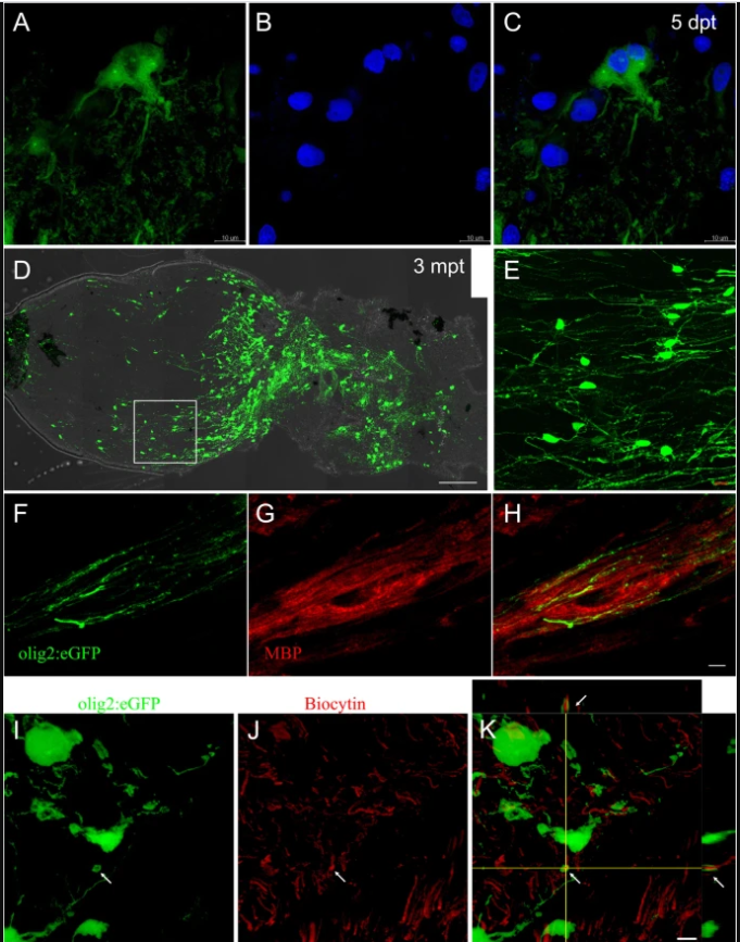 来自供体视神经的 mOLs 参与宿主鱼的髓鞘再生:为了研究局部 mOL 是否可以成为新形成的少突胶质细胞的资源,我们将成年 olig2:eGFP 鱼的视神经节段移植到成年 AB/WT 视神经的间隙中。宿主视神经中的一些 olig2+ 细胞在移植后第 5 天 (dpt) 产生了两个细胞核。在移植后 3 个月 (mpt) 时,olig2+ 细胞已散布在宿主的整个视神经中,并保持与 mOL 相似的状态。为了确定这些 olig2+ 细胞是否是 mOL,我们进行了 MBP 染色,发现这些 olig2+ 过程与 MBP 共定位。另外,RGC轴突在纵切面被olig2+突起包裹。在横切面上,在生物素标记的再生轴突周围观察到olig2+髓鞘突起。这些结果表明,来自成年斑马鱼视神经的局部 mOLs 可以存活并参与髓鞘再生进程。