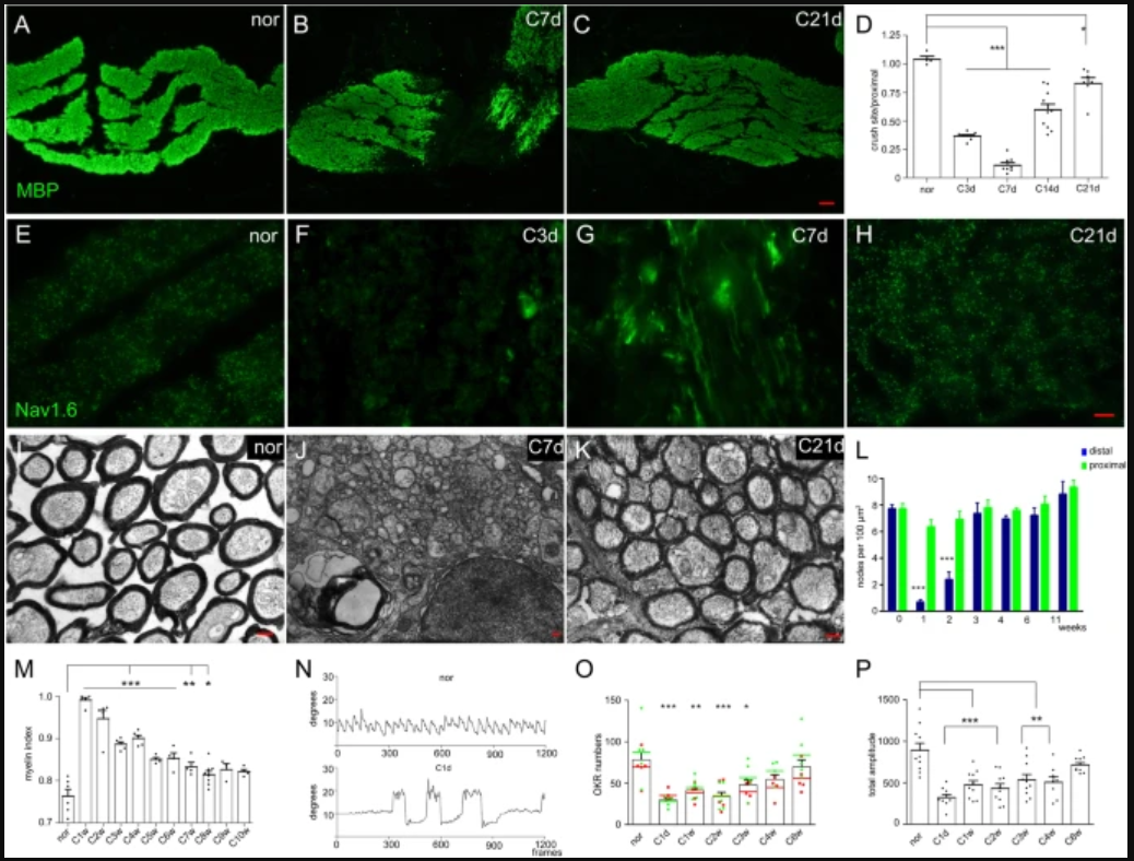 上述结果表明,局部mOLs可以产生新的OPCs。为了确定成年斑马鱼视神经损伤后髓鞘再生何时完成,我们通过免疫组织化学和 TEM 检查了髓鞘结构。 图 5a-c 显示MBP 信号在 7 dpi 时消失,并在 21 dpi 时重新出现。挤压部位与近端残端MBP强度比值在14 dpi前显著下降,21 dpi时略有恢复,28 dpi时达到正常水平。我们用 nav1.6 抗体标记钠通道以研究视神经损伤后 Ranvier 节点的恢复。Ranvier淋巴结密集散在正常视神经的视束中。在视神经损伤的早期,随着轴突退化,Ranvier 节点消失。7dpi时,远端节段可见nav1.6的线性分布,提示再生轴突未被少突胶质细胞覆盖。在伤后3周,大部分 Ranvier 节点已经恢复,统计结果显示与正常组无显着差异。在TEM观察下,我们分析了损伤后不同时间的髓鞘厚度。 在正常视神经中,轴突周围的髓鞘是致密的。7dpi时,脱髓鞘完成,大部分再生轴突裸露。21dpi时再生轴突髓鞘逐渐恢复。髓鞘指数结果显示,髓鞘厚度在 9 wpi 时完全恢复。