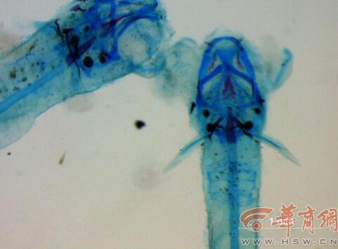 成年斑马鱼只有4~5厘米长,5天的斑马鱼也不过3~4毫米,牙齿更加细小,宽十几微米,长数十微米,肉眼较难辨别其细微变化,因此实验需要对鱼特殊染色,在显微镜下分离牙齿,然后利用扫描电子显微镜放大几千倍后再观察牙齿变化。