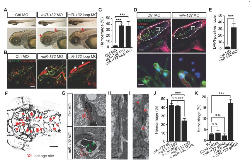 在《Cell Research》最近的一篇文章中,中国科学院的学者使用斑马鱼作为模型系统来检测miR-132(miR-132主要在神经元中表达)的功能。通过用吗啉代反义寡核苷酸拮抗miR-132,他们惊奇地发现,具有灭活的miR-132(miR-132 morphants)的斑马鱼幼虫表现出严重的颅内出血和BBB完整性受损,这些表现可以通过外源性红细胞外渗和外源性循环的脑积聚示踪剂来跟踪。通过使用Cas9(CRISPR相关蛋白9)和miR-132特异性引导RNA来破坏内源性miR-132基因座的基因组编辑也证实了这一发现。