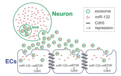 通过使用MicroCosm的miR-132变体的微阵列分析和计算预测,他们还发现编码真核延伸因子2激酶的eEF2K是内皮细胞中miR-132的直接靶标。 eEF2K通过真核延伸因子2(eEF2)的磷酸化抑制Cdh5的翻译延伸,并且神经元miR-132释放该抑制,并允许内皮细胞中的Cdh5基因表达增强BBB完整性。