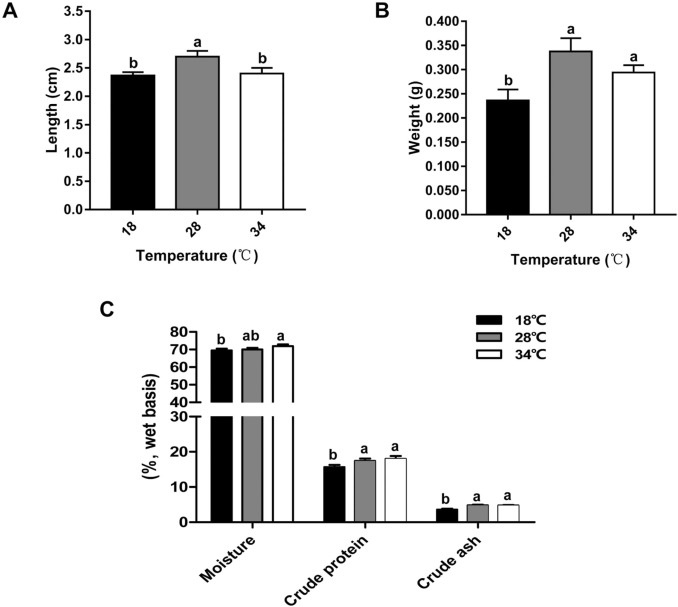 图 1. 温度对斑马鱼生长和近似组成的影响。A) 适应18 ℃、28 ℃和34 ℃的鱼最终体长; B) 适应18 ℃、28 ℃和34 ℃的鱼的最终体重; C) 18 ℃、28 ℃和34 ℃组斑马鱼的近似组成。
