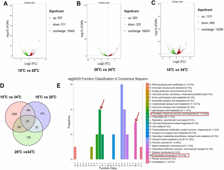 图4、不同温度下斑马鱼肌肉的差异表达基因(DEG)分析。