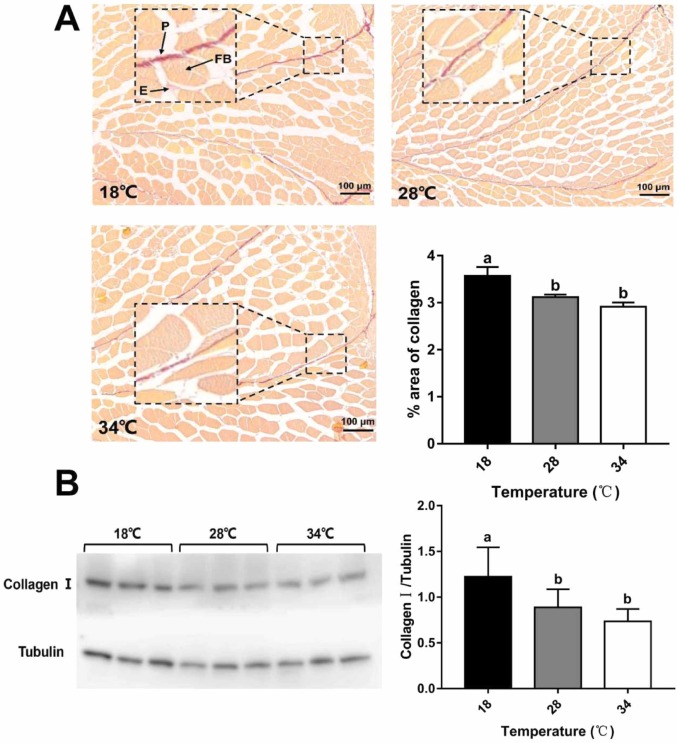 图 3、温度对斑马鱼肌肉中胶原蛋白沉积的影响。A) 适应18 ℃、28 ℃和34 ℃的鱼肌肉组织的天狼星红染色。 B)Western bolt分析显示18 ℃、28 ℃和34 ℃组肌肉中胶原蛋白I的表达水平。