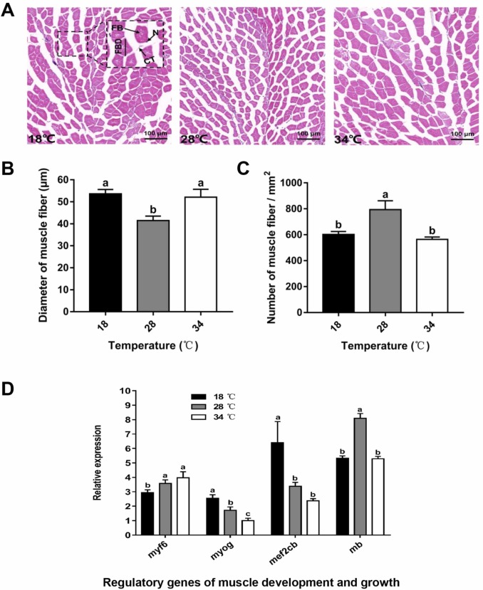 图 2、 温度对斑马鱼肌纤维特性的影响。 A) 适应 18 ℃、28 ℃ 和 34 ℃ 的鱼肌肉组织的组织学分析。B) 18 ℃、28 ℃和34 ℃组肌纤维直径统计; C) 18 ℃、28 ℃和34 ℃组肌纤维密度统计; D) qRT-PCR检测肌肉发育和生长相关基因。
