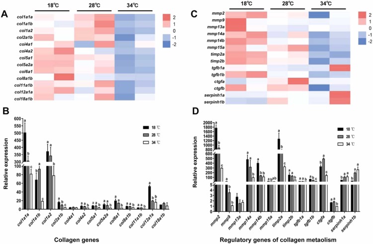 温度对胶原代谢相关基因转录的影响:为了探索温度影响肌肉胶原蛋白代谢的分子机制,进行了比较转录组分析以鉴定三个温度组之间的 DEG。结果表明,DEGs数量随着温度差异的增加而增加。其中,3个对照组共有28个DEG,包括两个编码I型胶原蛋白α1/2链的基因(col1a1a和col1a2)。28个DEGs的功能分类显示,这些基因被分配到11个功能项,前四项为“一般功能预测”(6个DEGs)、“功能未知”(4个DEGs)、“翻译、核糖体结构和生物发生”( 4个 DEG)和“细胞外结构”(3个 DEG)。为了进一步研究温度对胶原基因转录的影响,进行了qRT PCR以验证转录组数据。结果表明,肌肉中大部分胶原基因(col1a1a、col1a1b、col1a2、col2a1b、col4a2、col5a1、col5a2a、col6a1、col8a1b、col12a1a)的表达水平随着温度的升高而降低,与RNA测序结果一致。与18 ℃和28 ℃组相比,34 ℃组这些胶原基因的表达显着下调。接下来,我们测试了温度是否会影响胶原代谢的假定调节基因。结果表明,大多数调节胶原蛋白合成(tgfb1a、tgfb1b、ctgfa、ctgfb)和降解(mmp2、mmp9、mmp13a、mmp14a、mmp14b、timp2a、timp2b)的基因在34 ℃组中显著下调。而与18 ℃组相比,28 ℃和34 ℃组serpinh1a和serpinh1b(原胶原特异性分子伴侣,hsp47)的表达显著上调。所有这些数据表明温度可以对与胶原代谢相关的基因的转录产生深远的影响。