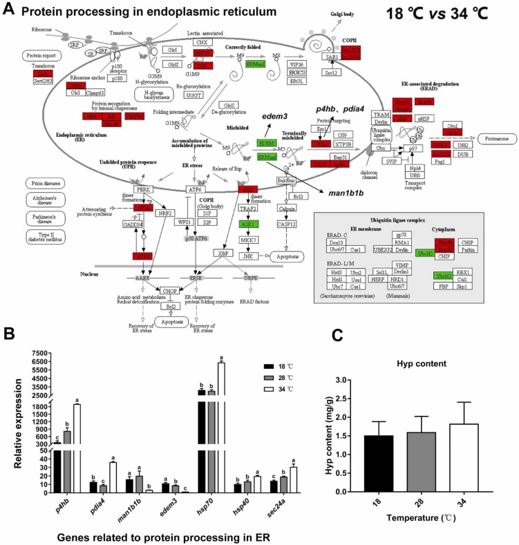 胶原代谢的过度变化(增加或减少)可能导致组织结构的变化或生理功能障碍。 在这项研究中,证明ER途径中的蛋白质加工受温度显著影响。内质网 (ER) 是蛋白质翻译后修饰和折叠的主要细胞内场所,包括原胶原。错误折叠的蛋白质与分子伴侣一起保留在 ER 腔内。最终错误折叠的蛋白质被定向降解。 热休克蛋白 (Hsps) 是内质网驻留分子伴侣,可防止蛋白质变性,并通过诱导对各种应激的耐受性来保护细胞。与先前的报道一致,在本研究中,这些基因(hsp40、hsp70等)在高温下显著上调,表明它们在温度适应中起着重要作用。脯氨酰 4-羟化酶 (P4H) 对原胶原分子中脯氨酸残基的羟基化对于稳定胶原蛋白的三螺旋结构很重要。值得注意的是,该途径中p4hb基因的表达在34 ℃组中显着上调。 众所周知,羟脯氨酸(Hyp)是脯氨酸羟基化的产物,主要存在于胶原蛋白中,传统上用于量化总胶原蛋白。众所周知,蛋白质合成、转换和折叠基因的差异调节对于热适应和驯化很重要。在本研究中,富集蛋白加工途径中的一些DEG与胶原纤维的合成、降解、折叠和组装有关,包括p4h、sec61、hyou1、hspa5、hsp90b1、sec13/31和sec23/24。其中,p4h对胶原中脯氨酸的羟基化具有特异性,而其他基因则没有特异性,可能与许多蛋白质的合成、周转、折叠和运输有关。因此,除了胶原蛋白,较高的温度也可能影响其他蛋白质的沉积。