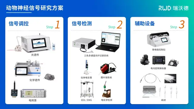 瑞沃德神经信号研究方案,涵盖神经信号调控,在体神经信号记录、离体神经信号记录等多种实验方法,从神经元单细胞、神经元群体、再到整个神经环路等不同水平,为神经科学提供系统全面的整体解决方案,助力神经环路解析及神经系统疾病机制研究的发展。