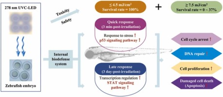 结论:由于 UVC 具有杀菌效果和低皮肤渗透性,预计 UVC 将用于消毒,特别是用于根除 SARS-CoV-2。在这项研究中,我们首次确定了UVC辐射在斑马鱼胚胎中的毒理学剂量及其转录组图谱。斑马鱼胚胎在恢复三天后通过立即激活p53和STAT信号通路来应对应激。我们进行了进一步的哺乳动物研究,以验证我们在斑马鱼胚胎中的结果。由于不同的UVC波长可能具有不同的效率,因此需要进一步研究。