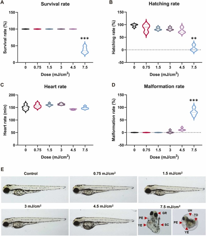 图 1. 72 hpf 时斑马鱼胚胎的形态测量。 斑马鱼早期原肠胚阶段(5-6 hpf)的胚胎暴露于不同剂量的 UVC(0、0.75、1.5、3、4.5 和 7.5 mJ/cm2)。(A) 照射后斑马鱼胚胎的存活率、孵化率、心率和畸形率。(E) 对照组和UVC照射胚胎的代表性图像。