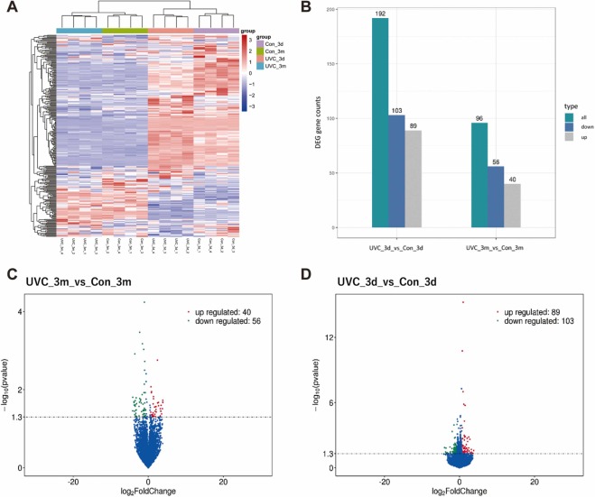 UVC辐射诱导生物防御系统的分子机制:尽管观察到了轻微的畸形,但所有接受 4.5 mJ/cm2 UVC 照射的斑马鱼胚胎都存活了下来,表明这种辐照强度可能时胚胎内部生物防御系统抵御 UVC 辐射的极限。因此,我们在随后的分析中使用该辐射强度来揭示这种生物防御的分子机制。在 4.5 mJ/cm2 的 UVC 照射后,在 3 mpi 和 3 dpi 收集胚胎进行 RNA-seq 分析,,分别作为对UVC照射的快速反应和晚期反应的测量。图2显示了在3 mpi和3 dpi下UVC辐照胚胎的转录组图谱。