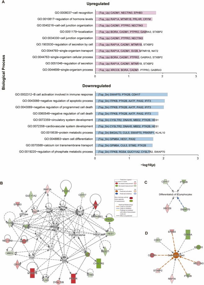 生物信息学分析显示,对UVC辐射反应最快的三种生物转化是“应激反应”,其次是“防御反应”和“免疫反应”。此外,还研究了UVC辐射调节的生物途径,前三个受调节的途径是“p53的转录调节”、“Nectin/NECL信号途径”和“BLIMP-1的转录调节”。IPA软件预测的最高监管网络如图3B所示,它与“疾病和功能”有关,如“听觉疾病、神经疾病、器官损伤和异常”。与GO分析结果一致,通过通路分析确定了一个下调的“B淋巴细胞分化”网络,以及一个上调的“细胞-细胞接触”网络,该网络对UVC辐射反应迅速。