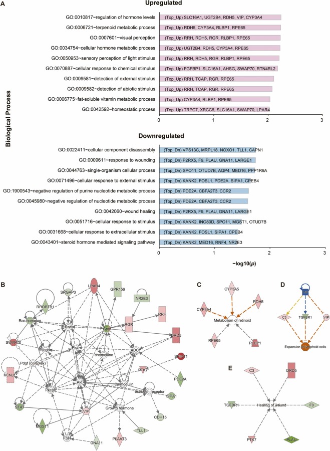 紫外线照射后的迟发反应:在 3 dpi 斑马鱼胚胎中,在 24,507 个测序基因中,参数 FDR < 0.05 和绝对倍数变化≥ 1.5仅筛选出 9 个 DEG。然而,当选择参数设置为p < 0.05和绝对倍数变化≥ 1.5共鉴定出192个DEG,包括89个上调基因和103个下调基因。通过分别输入上调和下调的DEG获得的生物过程类别如图5A所示。对于上调基因,与生物调节(GO:0010817,激素水平调节;GO:0042592,稳态过程)、细胞代谢过程(GO:0006721,萜类代谢过程;GO:0034754,细胞激素代谢 过程)和对刺激的反应(GO:0009581,检测外部刺激;GO:0009582,检测非生物刺激)有关。下调的 DEG 与细胞反应(GO:0022411,细胞成分分解;GO:0044763,单生物细胞过程;GO:1900543,嘌呤核苷酸代谢过程的负调节;GO:0045980,核苷酸代谢过程的负调节; GO:0051716,细胞对刺激的反应)和对刺激的反应(GO:0009611,对创伤的反应;GO:0071496,细胞对外部刺激的反应;GO:0042060,伤口愈合;GO:0031668,细胞对细胞外刺激的反应;GO :0043401,类固醇激素介导的信号通路)有关。