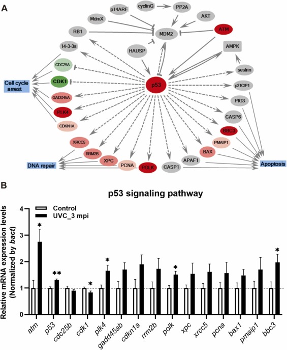 我们进一步进行了 qPCR 以验证快速响应 UVC 照射的顶级调节生物通路,即 p53 信号通路。 KeyMolnet 软件预测的 p53 的计算机分子网络的细节如图 4A 所示。该网络中的15个关键基因被选择用于qPCR。紫外线照射后,p53上游的基因,即ATM丝氨酸/苏氨酸激酶显著上调(2.75倍;p < 0.05),并且p53的表达在UVC照射的胚胎中显著上调(与对照组相比)(1.3倍;p < 0.01)。此外,polo 样激酶 4(plk4)、聚合酶kappa(polk)和 BCL2 结合组分 3(bbc3) 显著上调。与对照组相比,在 UVC 照射组中发现细胞周期蛋白依赖性激酶 1(cdk1)显著下调。