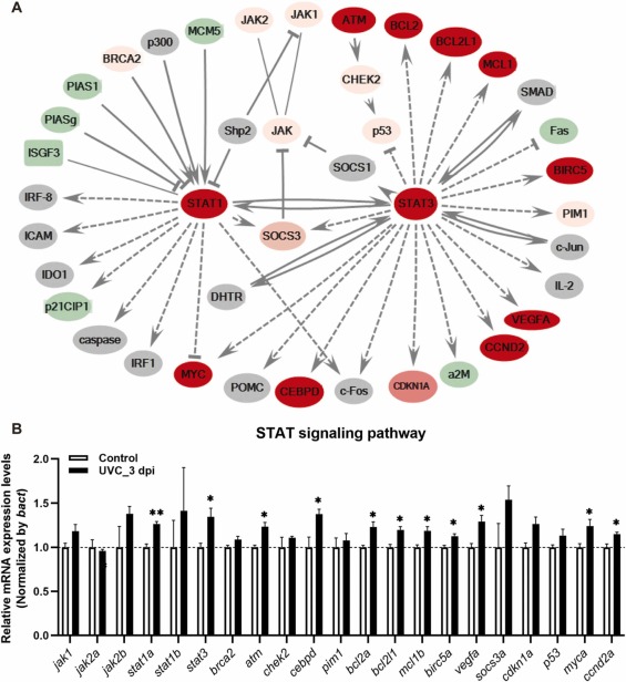图6、斑马鱼胚胎对UVC辐射(3 dpi)的后期反应中,基于qPCR验证编码STAT通路中间产物的基因的表达。