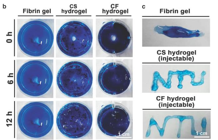 近期,一篇发表在Nature子刊《NPG Asia Materials》上的一篇文章,介绍了一种新型的壳聚糖 - 纤维蛋白(CF)为基础的自愈型水凝胶,可注射使用并在2周内降解到70%左右,更重要的是接种在CF水凝胶中的血管内皮细胞能够形成毛细血管样结构。