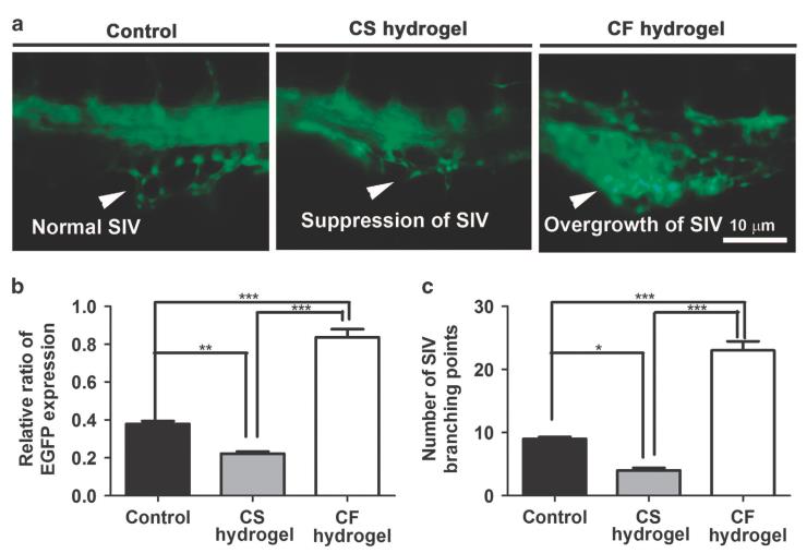 因为得到了这样的体外证据支持,研究者下一步就是希望通过体内实验来测定CF自我修复凝胶在血管生成中的突出作用。在这里,研究者们使用的是独特的转基因斑马鱼Tg(fl i1a:EGFP)品系,其中所有的EC由于EGFP的表达而显示绿色荧光。结果,实验证明单独注射CF水凝胶能促进斑马鱼周围血管的生成。
