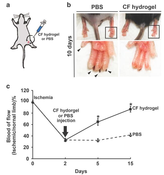 虽然斑马鱼模型是确定通过CF水凝胶诱导的体内血管生成的便利工具,但仍需要进一步研究来验证其治疗潜力。于是,研究者们在代表外周动脉闭塞性疾病的小鼠后肢缺血的疾病模型中进行了初步测试,而实验证明CF水凝胶确实能拯救小鼠缺血后肢血液循环。