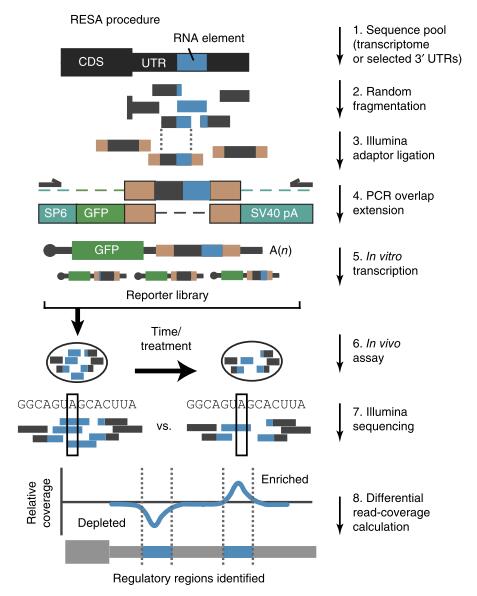 为了实现mRNA的全面监管,研究员们设计了一个具有灵活序列并有能力从大量候选区域中筛选出功能性RNA片段的体内报告系统。有别于常规的寡核苷酸合成,RESA是将序列扩增与随机片段化偶联,由此产生高度重叠的有效片段。