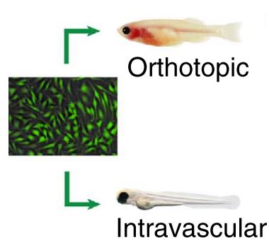 研究者首先创建了一个由黑色素细胞特异性mitfa启动子驱动人BRAF V600E基因,且带有绿色荧光蛋白(GFP)报告子的转基因斑马鱼品系,进而用该品系斑马鱼获得了斑马鱼特异性黑色素瘤细胞系——ZMEL1 GFP,这个细胞可以移植到透明鱼内并进行可视化体内成像(下图)。