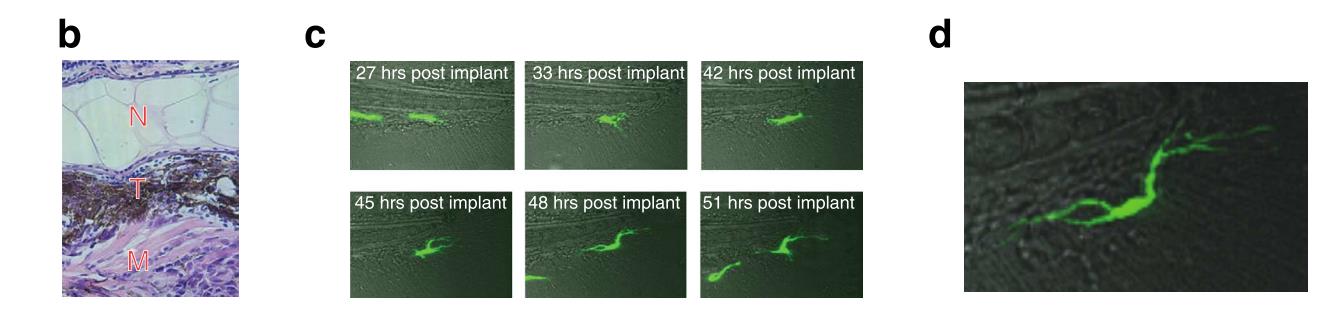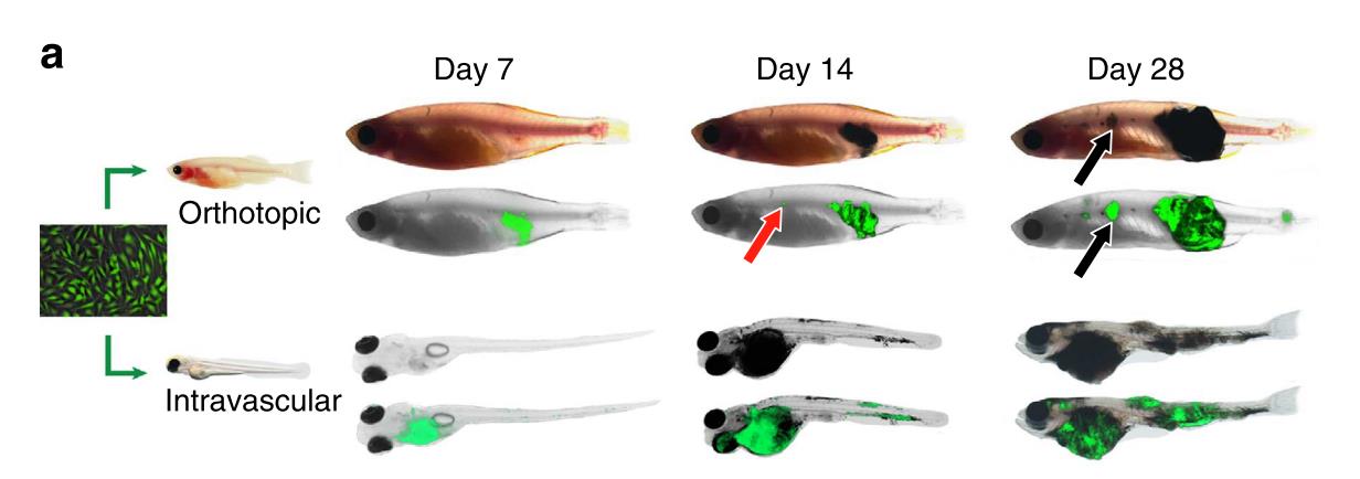为了证实这一点,研究员直接将ZMEL1-GFP细胞移植到透明斑马鱼幼鱼的血管系统中,绕过初始皮肤部位(图1a,底部)。使用幼鱼而不是成鱼,是希望血管系统有更大的可及性。细胞最初广泛传播,在24小时内外渗在几个区域,包括皮肤,尾部造血区域和眼睛。在接下来的7-28天,哪里形成广泛的巨球蛋白酶,其也显着地着色(图1a,下),其外观由表皮皮下转移所支配。在成鱼和幼鱼的实验中,这种转移扩散的模式类似于IV期(Tx / Nx / M1a)疾病。