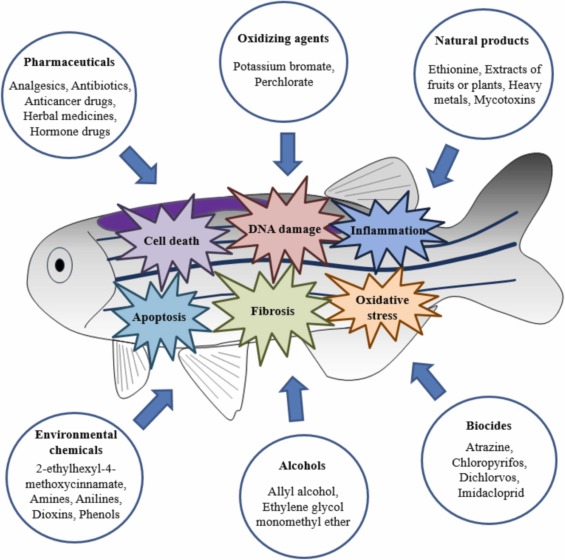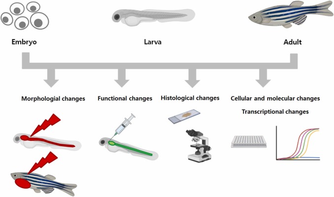 图 1. 斑马鱼不同生命阶段测量到的化学性肾损伤。胚胎、仔鱼和成年斑马鱼暴露于化学品后的形态、功能、组织学、细胞、分子或转录水平变化。