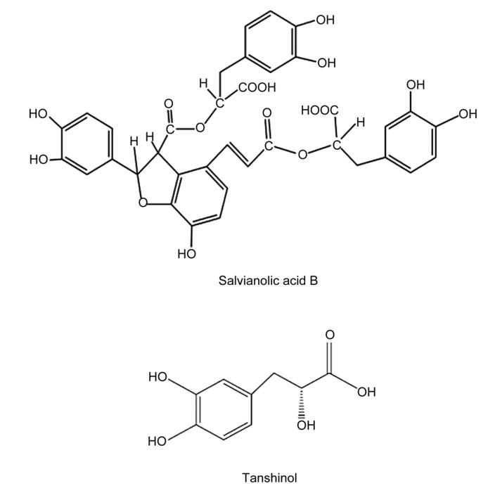 丹酚酸B(也称紫草酸B),是丹参的主要活性成分,在中国临床上被广泛用作心脑血管疾病的治疗中。作为一个有七个酚羟基的多酚酸化合物,丹酚酸B是最强的天然抗氧化剂之一,并且其在体内能代谢成丹参,一个含有2个酚羟基基团的强力天然抗氧化剂(下图)。有趣的是,之前的研究表明,这两个物质都有促进成骨细胞功能和分化的功用,能有效治疗因为长期过度用地塞米松而引起骨质疏松的大鼠。