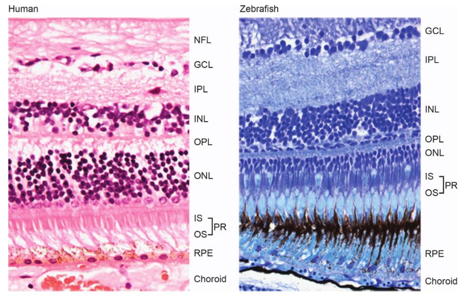 斑马鱼的眼睛占了斑马鱼整体体积很大的一部分,这使得早期的胚胎发育过程中的眼部操作成为了可能。在受精后72小时,斑马鱼的视网膜便接近成熟,且其形态不论是解剖学还是功能上都与人类的视网膜类似(图1)。斑马鱼视网膜上的不同类型的感光器官形成了一种高度组织化的异型感光器官嵌合体。由于昼间活动的生活习性,斑马鱼视网膜上的视锥细胞很丰富,类似于人的视网膜黄斑部位,其视锥细胞的密度也和人非常接近。