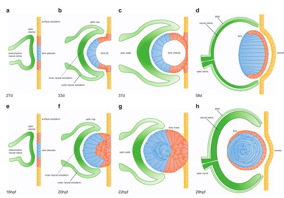 妊娠第22天,前脑两边视神经沟的形成标志着人类胚胎眼发育的初步建立。在接下来的一周,视沟外翻会形成视窝,接着形成视神经囊泡。斑马鱼的眼发育和人类的主要区别就在于此,斑马鱼的神经管会发展为一种被称为神经龙骨细胞的固体物质,进而发育出视神经原基和视神经管腔等(12个体节阶段)。和人眼发育类似,在受精后16-20小时后,斑马鱼视泡会形成由视网膜神经上皮和色素上皮(上图a和e)组成的两层视杯。