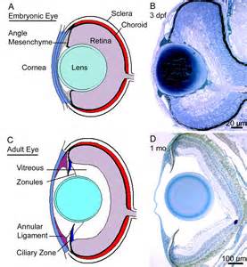 斑马鱼的眼发育与人类和其它脊椎动物非常相似(下图),都是从三个不同的胚胎组织发育起来的。像神经外胚层会分化成神经视网膜、视网膜色素上皮细胞、视神经秆、虹膜扩张器、括约肌和睫状体;外胚层会分化形成晶状体,接着形成结膜和角膜上皮;而间充质则是形成角膜内皮和基质、虹膜基质、睫状肌和血管、巩膜和外管系统。