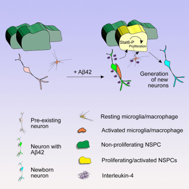 研究人员在阿尔茨海默病的斑马鱼模型中发现斑马鱼脑部的免疫细胞和死亡的神经元会释放免疫相关分子IL-4。该分子会为神经干细胞提供危险信号,随后神经干细胞通过STAT6参与的细胞内机制开始增殖过程。