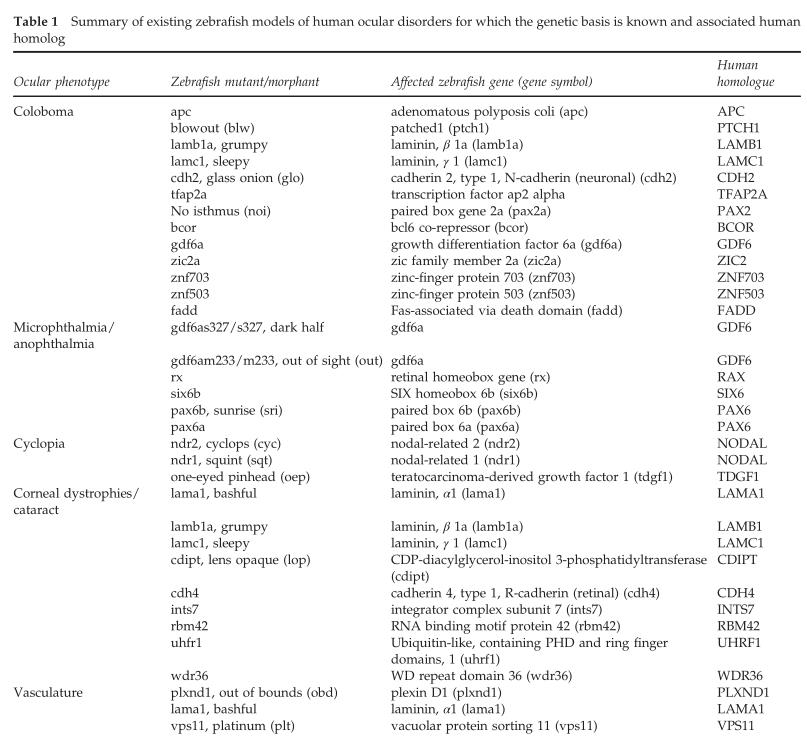 眼缺损的斑马鱼模型为理解视神经裂缝形态提供了一个重要的范例,在斑马鱼上对与人类同源的基因进行突变(表1部分),可以观察到视网膜和晶状体的缺陷,从而为眼部缺陷疾病的机制研究和治疗进行参考。