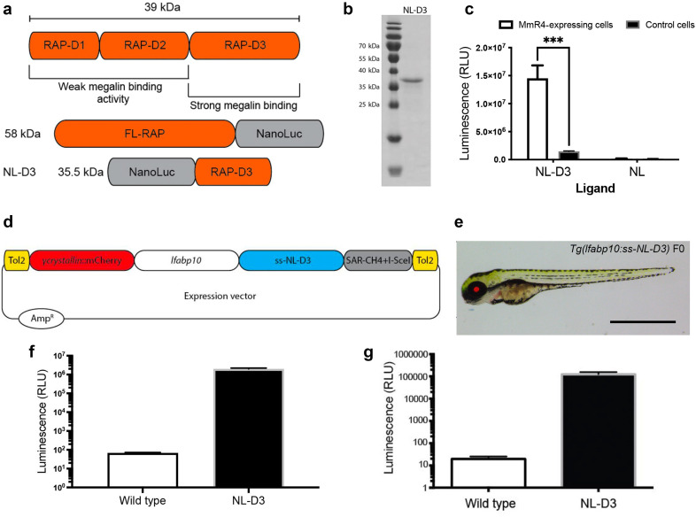 体外重组 NL-D3 可被内吞:目的是开发一种转基因报告基因来研究斑马鱼前肾近端小管的内吞作用。近端小管内吞途径的一个重要组成部分是具有多个配体的600 kDa巨蛋白受体。巨蛋白的功能和加工依赖于受体相关蛋白,该蛋白包含与巨蛋白具有不同亲和力的三维结构域。我们将大鼠受体相关蛋白与NL融合。全长受体相关蛋白-NL融合产生大小为58kDa的蛋白。假设限制报告蛋白的大小有助于其通过肾小球毛细血管壁,因此我们将受体相关蛋白的14 kDa D3结构域融合到NL的C端,以产生NL-D3,其预测大小为35.5 kDa。我们首先想确认 NL-D3 融合蛋白可以报告巨蛋白依赖性内吞作用。在大肠杆菌中表达重组 NL-D3,并分离纯化蛋白质。然后将重组NL-D3用于HEK293细胞的摄取实验,该细胞稳定表达截短的megalin。通过裂解细胞并测量发光来测量摄取,与用重组NL-D3孵育的对照HEK293细胞相比,用重组NL3-D3培养的HEK293-MmR4细胞具有大约10倍高的摄取水平。对照HEK293细胞和HEK293-MmR4细胞在与NL孵育后均未显示发光。这些体外结果表明 NL-D3 与巨蛋白结合并容易被内吞。