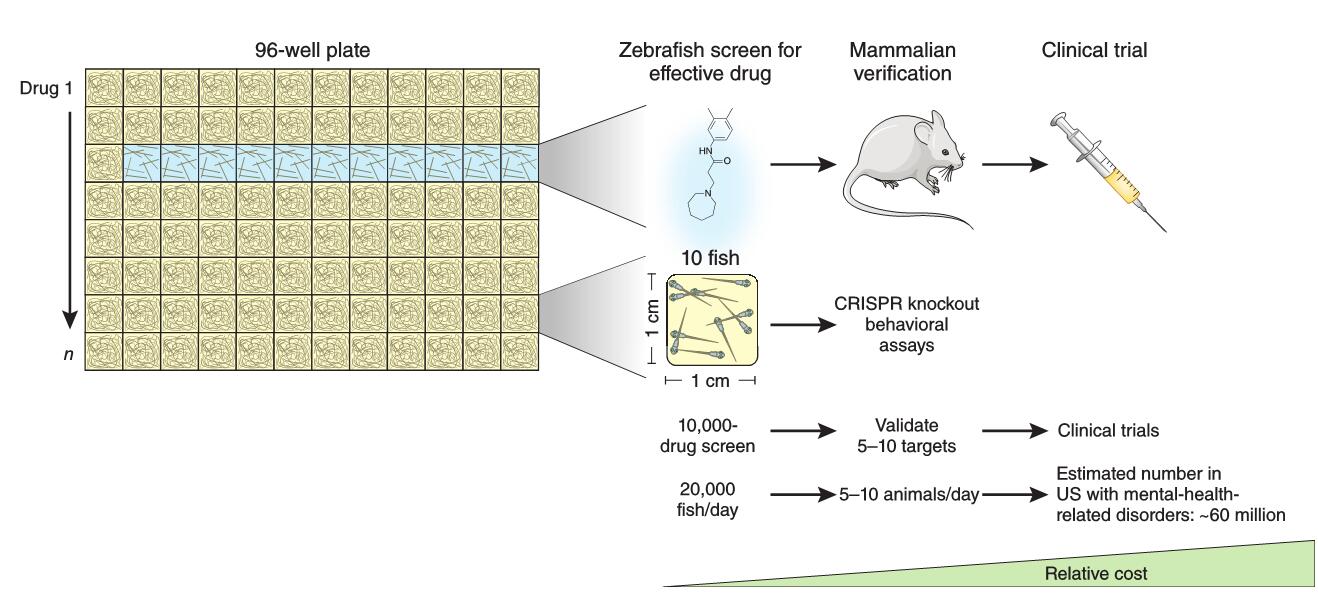 现在,研究治疗精神类疾病药物的有效方法远远无法满足新药研发的需要。一方面的既是因为缺乏对这些疾病高度复杂的生物机制的理解,也是因为对无法完全概括这种复杂性的体外细胞或化学分析手段的过度依赖。另一方面是在非人精神病药物筛选模型如啮齿类上进行实验的消费是惊人的,不适合用于大型化学药物库的高通量筛选(一个保守的估计是筛选10,000个药物至少需要50,000只小鼠),而且筛出的药物通过临床试验的成功率很低。