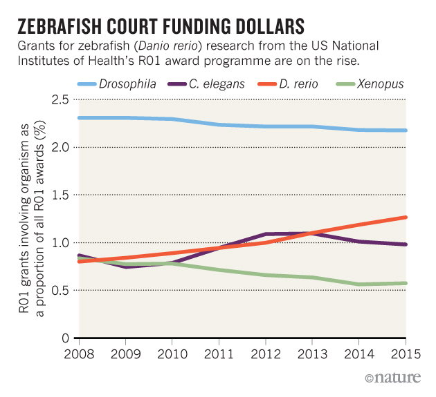近期,一份来自美国国立卫生研究院(NIH)的研究补助金分析书表明,斑马鱼正在逐渐成为模型生物研究中冉冉升起的新星,此文章被发布在Nature中,doi:10.1038/nature.2016.20391。