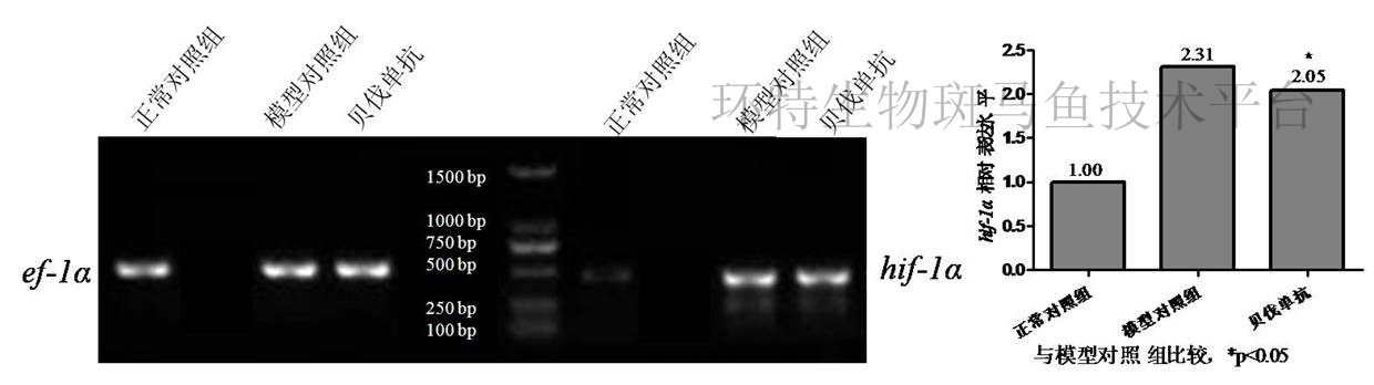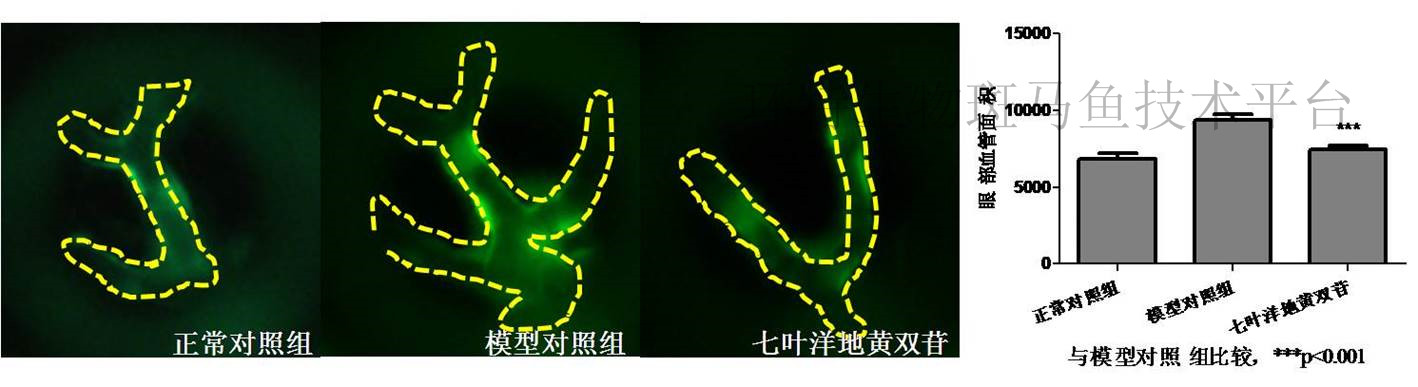 环特生物通过这一原理成功摸索出了斑马鱼眼部血管增生模型,并用阳性药七叶洋地黄双苷、贝伐单抗成功地进行了模型的验证。通过在转基因血管绿色荧光斑马鱼品系斑马鱼观测眼部血管面积、眼组织病理学和hif基因的表达来筛选有效的抗血管活性物质。