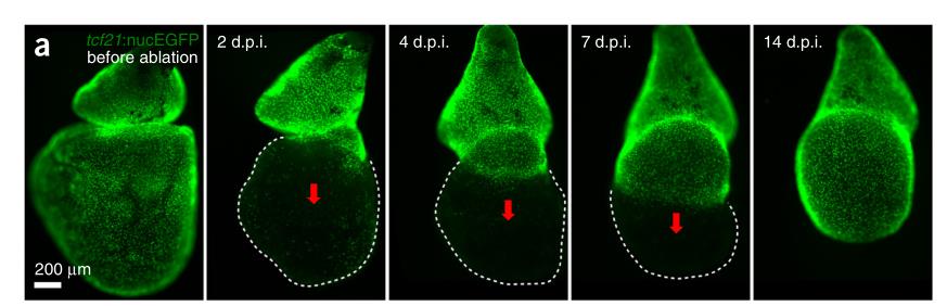 斑马鱼之所以能被用来研究不同类型损伤导致的心脏组织缺失或损坏,是因为斑马鱼的心脏在受损后能通过心肌细胞的增殖再生而得到恢复,这就为心脏组织再生研究提供了一个非常有价值的系统模型。其中对心外膜的研究更是广受欢迎,因为无论是在斑马鱼还是在哺乳动物上的研究都已经证明了心外膜在心脏再生中的价值。