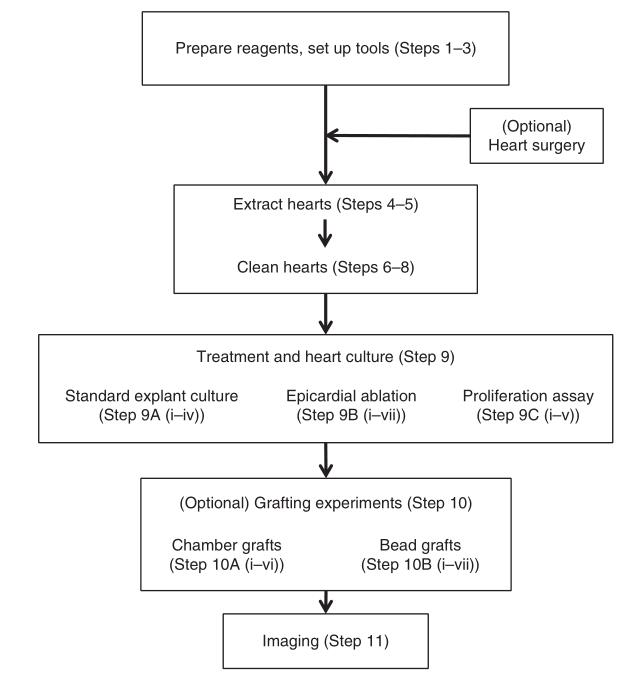 文章中描述的这个体外移植系统(下图为整个过程的概览),不仅能够维持几个星期的活性,更能保持大部分的心脏形态和收缩功能。利用这种方法和分子遗传工具可以实时监控并报告成年斑马鱼心外膜组织的再生能力。此外,这种外植体培养系统还可适于组织移植和化学筛选。