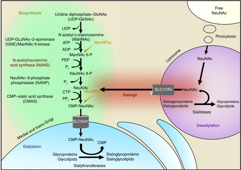 大脑是所有人体器官中含有总唾液酸最高的器官,唾液酸主要分布于糖蛋白和糖脂,如神经节苷脂在神经组织特别丰富,NANS在人脑中高度表达。在九个发病严重发育迟缓和骨骼发育不良的个体中检测NANS(编码N-乙酰神经氨酸,又称唾液酸)的等位基因突变后发现,都存在NANS表达减少的现象。