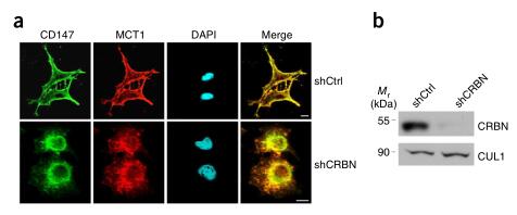 通过鉴定发现了CRBN的泛素独立的生理伴侣样功能是促进了基础免疫球蛋白(basigin,BSG;也被称为CD147)的成熟和溶质载体家族16成员1(SLC16A1;也称为MCT1)蛋白。整个过程包括CD147-MCT1跨膜复合物的形成和激活,这促进了各种生物功能,包括血管生成、增殖、侵袭和乳酸输出。研究发现,各种免疫调节药物在结合CD147和MCT1方面的能力远胜CRBN,导致了CD147-MCT1复合物的不稳定。