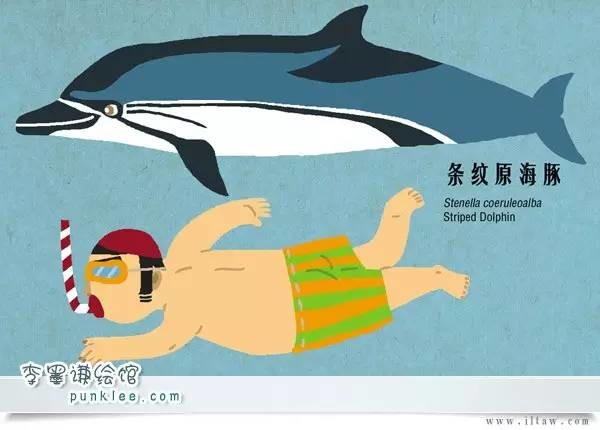 又称蓝白海豚。在全球温带、亚热带及热带温暖水域均有分布。这种海豚因体侧的暗色条纹而得名。它们行为活跃,非常引人注目,有时跳起可高达7米,并能表演后空翻、直立出水回旋及倒立豚游。这种海豚的数量也十分可观,仅在北太平洋西部的族群就高达570000头,属于无危物种。成年条纹原海豚可长到1.8米-2.5米长,出生时的幼体约1米长。