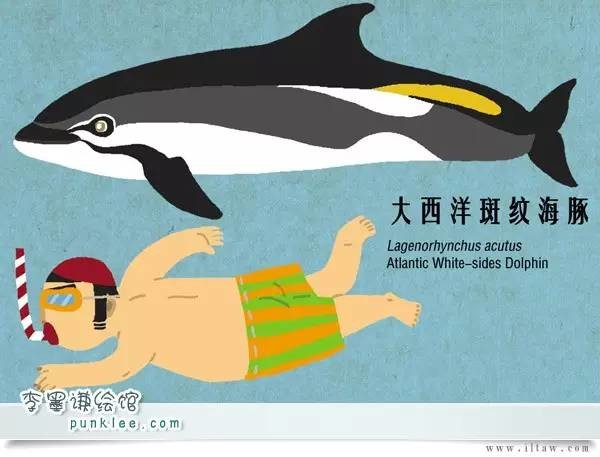 又称弹跳海豚,外形酷似真海豚,但嘴喙较短,且身体粗壮。其主要分布于北大西洋北部的冷温带及亚北极海域。大西洋斑纹海豚种群数量丰富,仅在苏格兰西海岸就分布着96000头,目前属于无危。它们是海上的快泳健将,且善于空中绝技,约每10-15秒就会破水而出或跳离海面。成年大西洋斑纹海豚可长到1.9米-2.5米长,出生时的幼体约1米-1.3米长。
